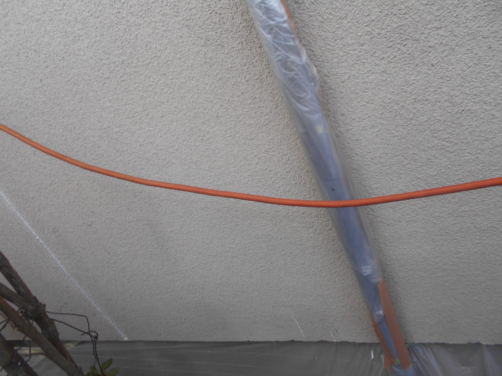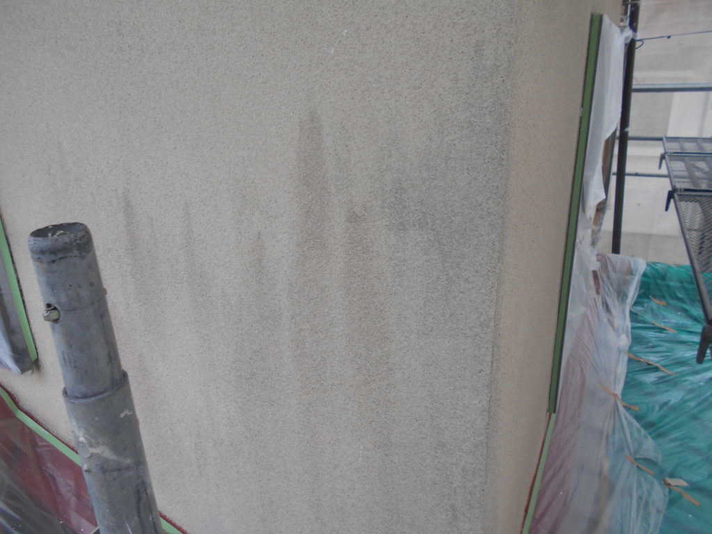外壁を高圧洗浄しても落ちなかったカビを、次亜塩素酸で殺菌しています。